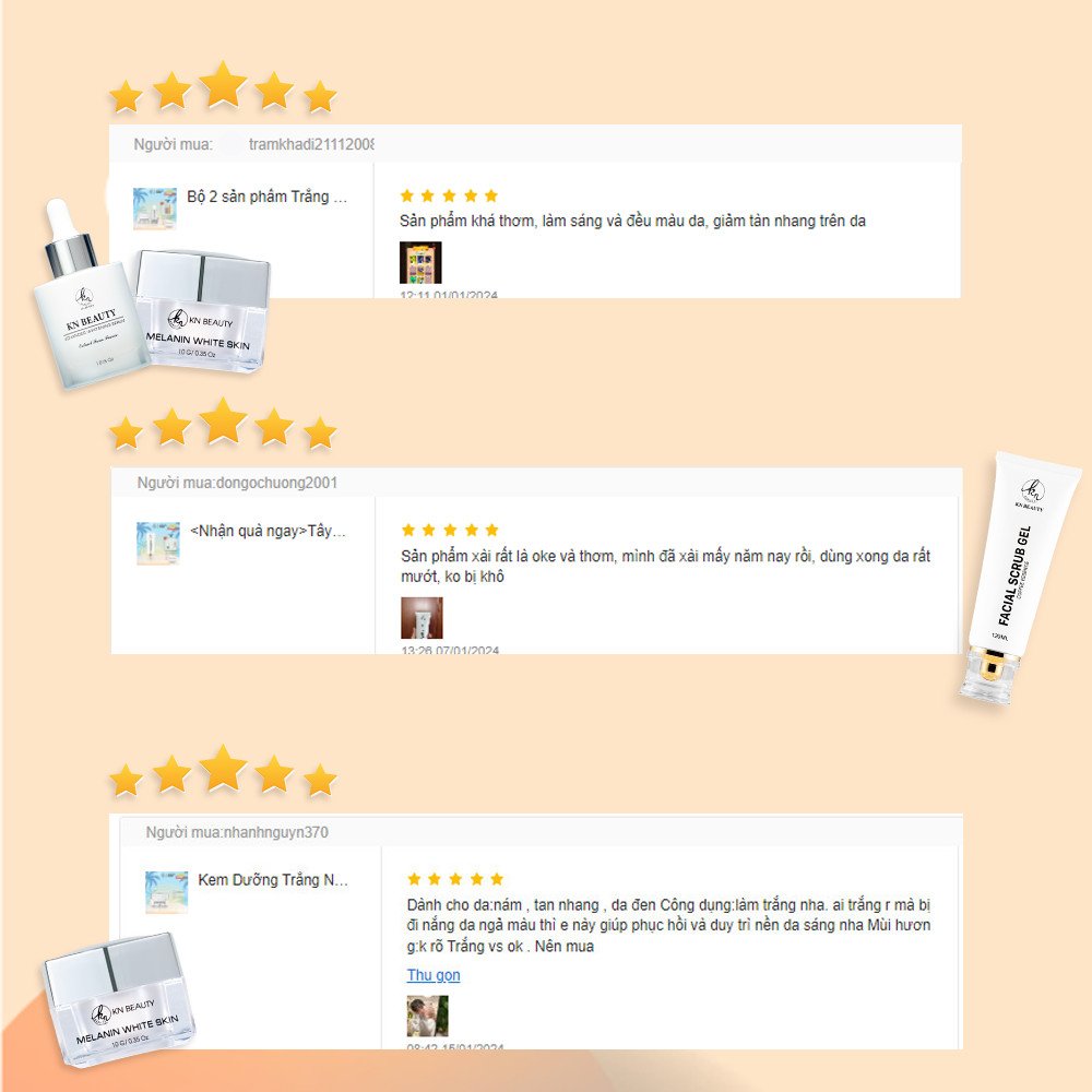 Thật sự mỗi lần đọc lời feedback của mọi người ở bất kì đâu thì KN Beauty cũng rất vui và cảm thấy đó là động lực để đưa sản phẩm tiếp cận đến nhiều làn da hơn. KN Beauty gửi lời cảm ơn đến các bạn khách hàng đã không ngần ngại giới thiệu KN Beauty đến với nhiều bạn bè, người thân của các bạn.
