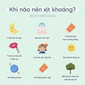 Xịt khoáng là một sản phẩm dưỡng da rất phổ biến hiện nay. Nó có thể được sử dụng vào nhiều thời điểm khác nhau trong quá trình chăm sóc da. Dưới đây là một số trường hợp khi nên sử dụng xịt khoáng: